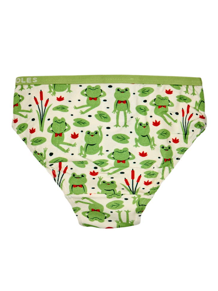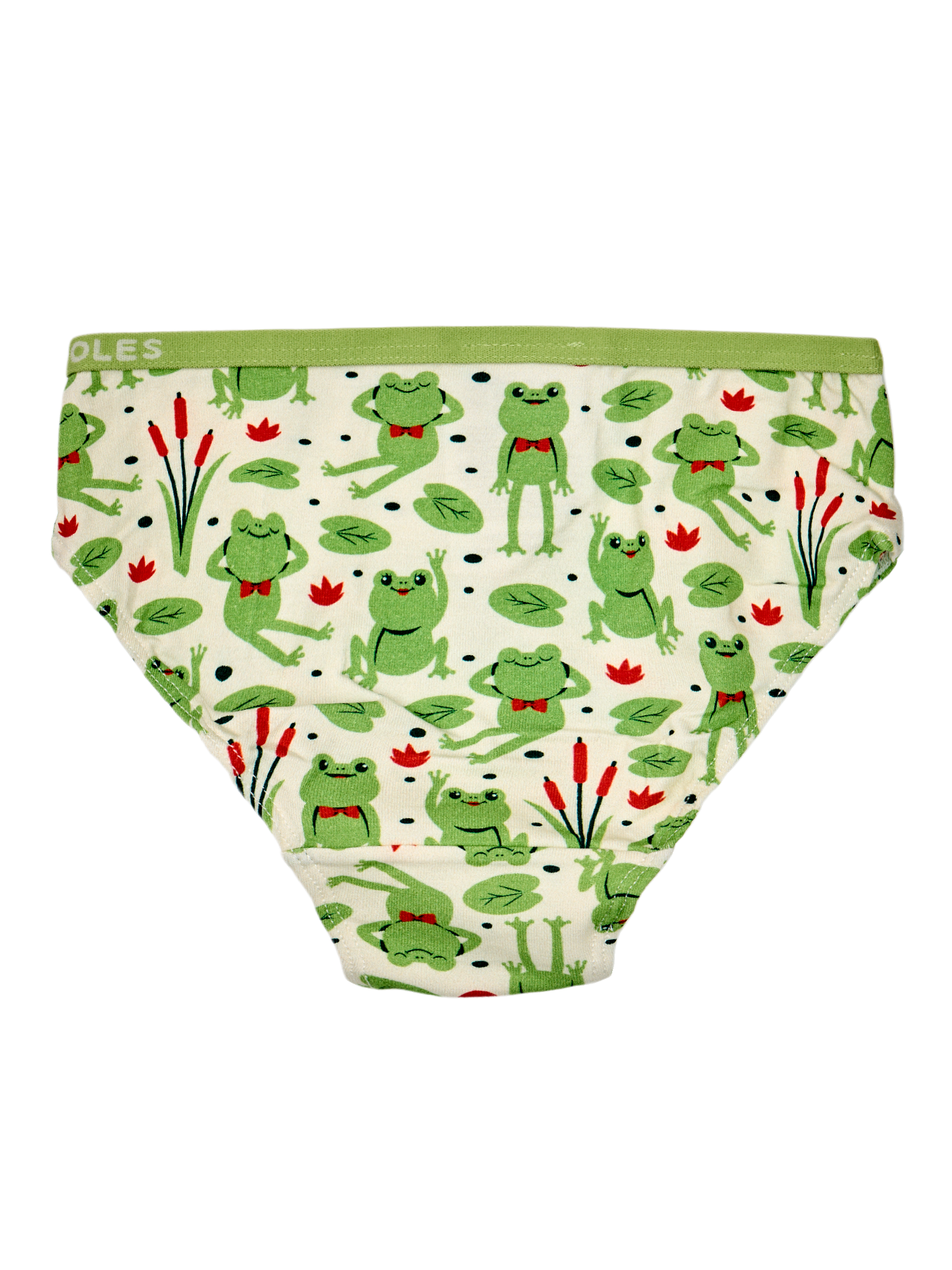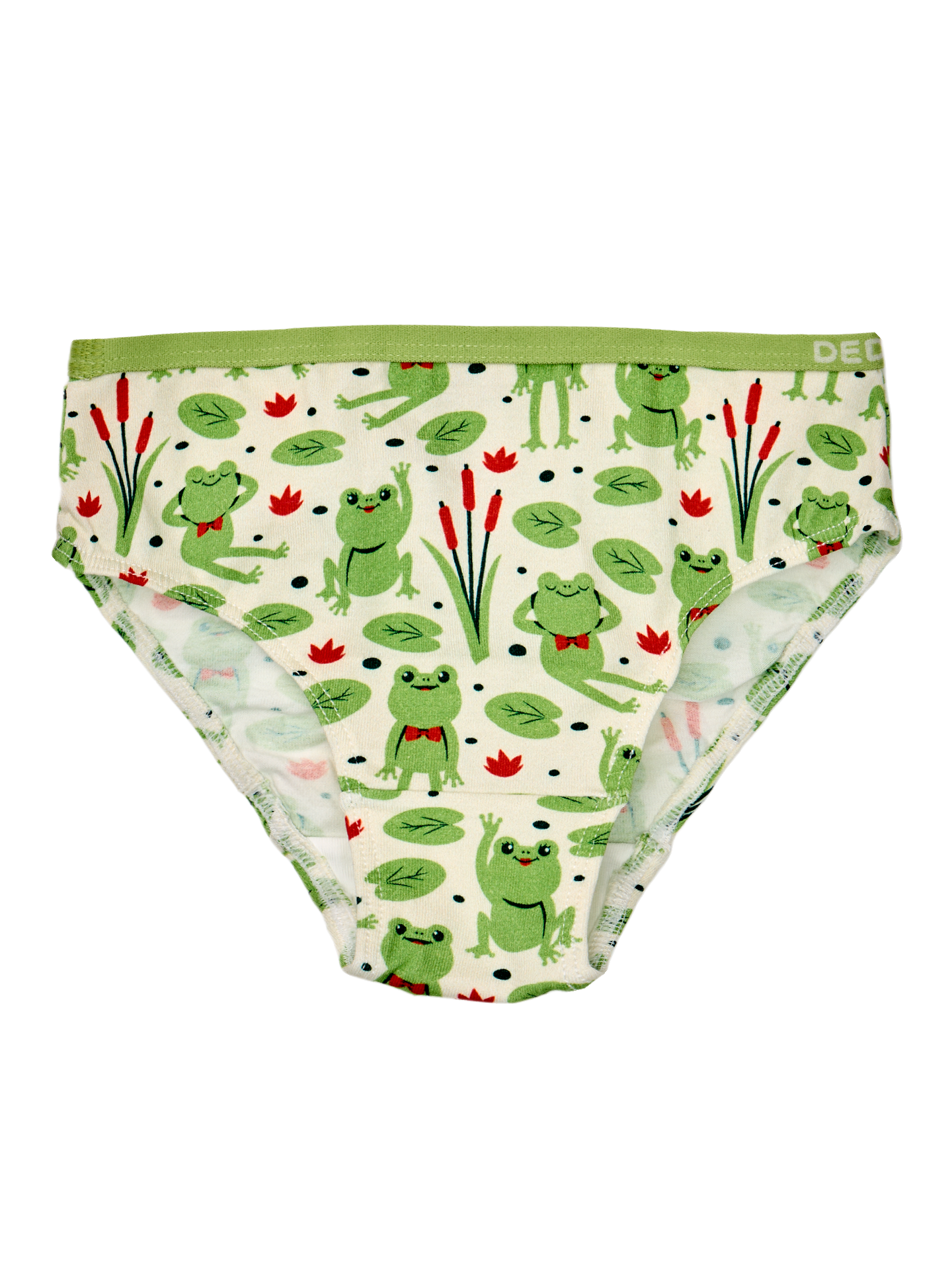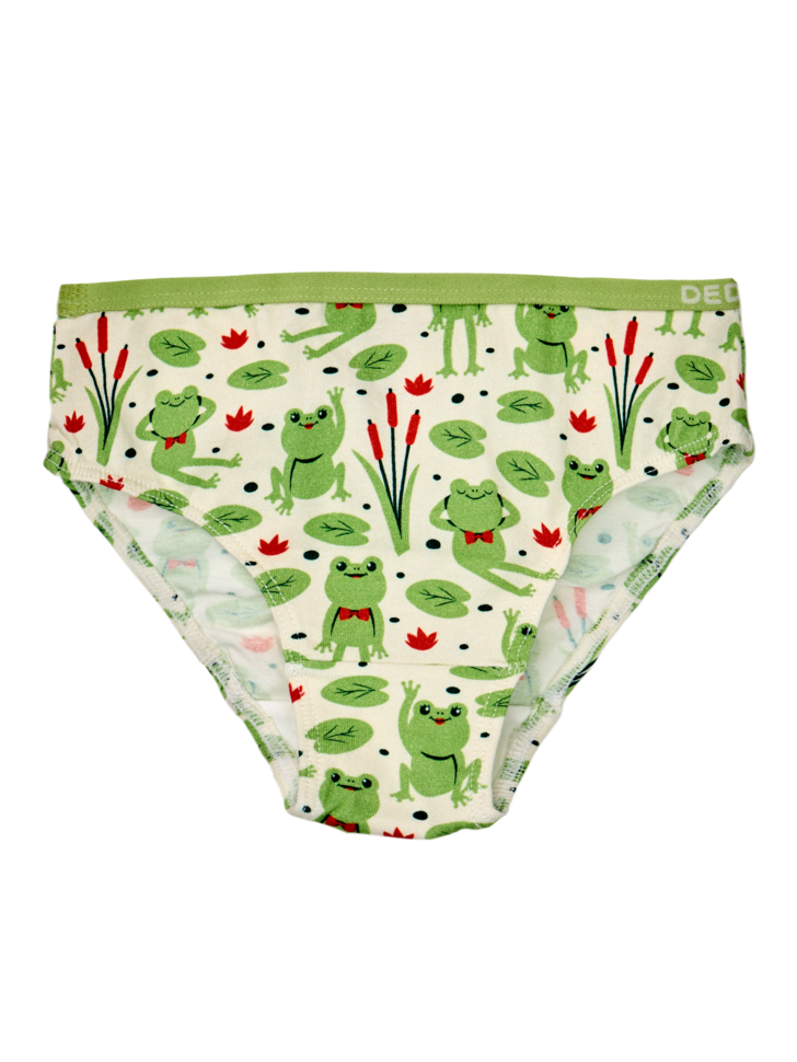 Жабите са много пъргави и със силните си крака могат да скочат на дължина до десет пъти собствения си размер. Дали това скокливо земноводно ти напомня на твоето мъниче? Зарадвай я с тези весели бикини за момичета, изработени от органичен памук.